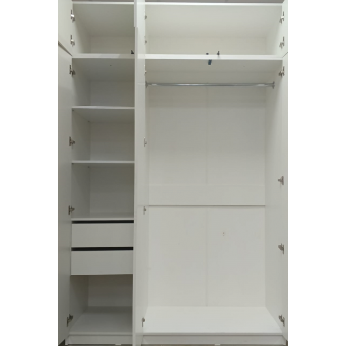 Два больших и вместительных выдвижных ящика, глубиной 150 мм оснащены шариковыми направляющими полного выдвижения, рассчитаны на большую нагрузку. Вместительные и глубокие полки высотой 400 мм позволят практично и с удобством хранить вещи, одежду для повседневной носки, постельное белье, полотенца и т.д. Характерной особенностью данного шкафа является профильная ручка длиной в половину высоты двери, а это позволит открывать дверь, потянув за ручку в любом удобном для Вас месте, при этом не оставляя никаких следов на матовой поверхности двери. Так же двери оснащены петлями с доводчиком, благодаря которым никогда не возникнет беспокойство, а закрыт ли шкаф? Таким образом попадание пыли и запаха внутрь шкафа предотвращается "самозакрыванием" дверей, что  более бережно сохранит вещи. Контрастируя на белом фоне самого шкафа черная ручка придает мебели современный вид. Конструкцией шкафа предусмотрена антресоль с распашными створками, которые открываются нажатием благодаря демпферу. Все это делает шкаф СИТИ более вместительным, функциональным, современным  и практичным на фоне другой мебели. А благодаря белой расцветке шкаф прекрасно впишется в любое помещении: жилая комната, терраса....