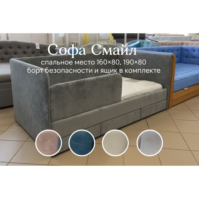 В основе диван-кровати Смайл лежит надежный каркас из высококачественного ДСП толщиной 16 мм. Особую прочность конструкции придают боковины толщиной 40 мм, обеспечивающие длительный срок службы мебели. Спальное место размером 800х1600 мм и 800х1900мм располагается на высоте 300 мм от пола, что делает его удобным для детей разного возраста.